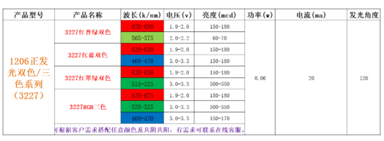 1206侧发灯珠双色、三色RGB参数: