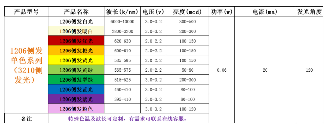 1206侧发灯珠参数:
